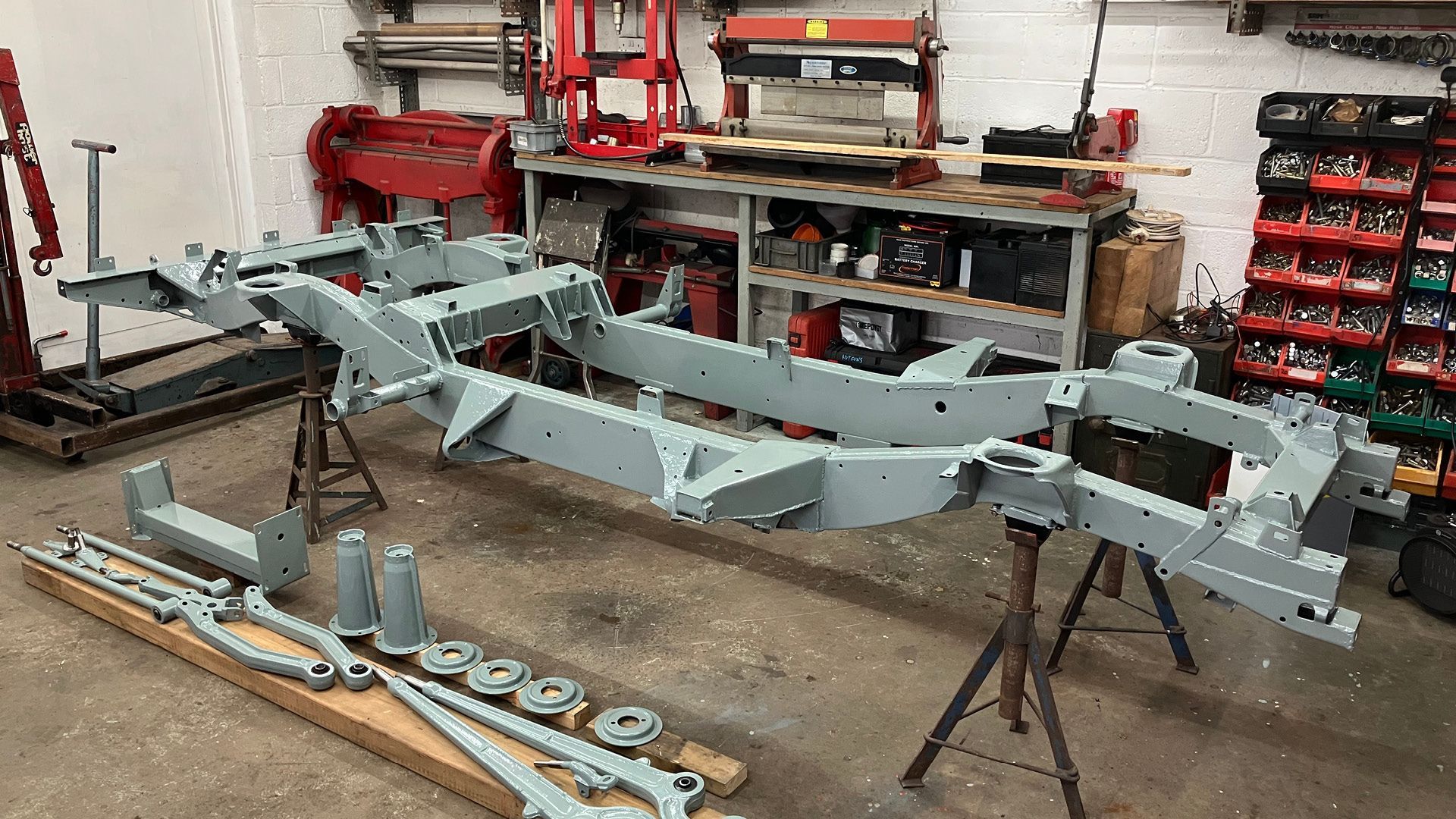 The chassis was repaired where necessary and thoroughly sanded to bare metal. Richard applied a two-stage protective system: red oxide primer for adhesion and corrosion resistance, followed by a durable grey top coat that provides a stable, protective finish.